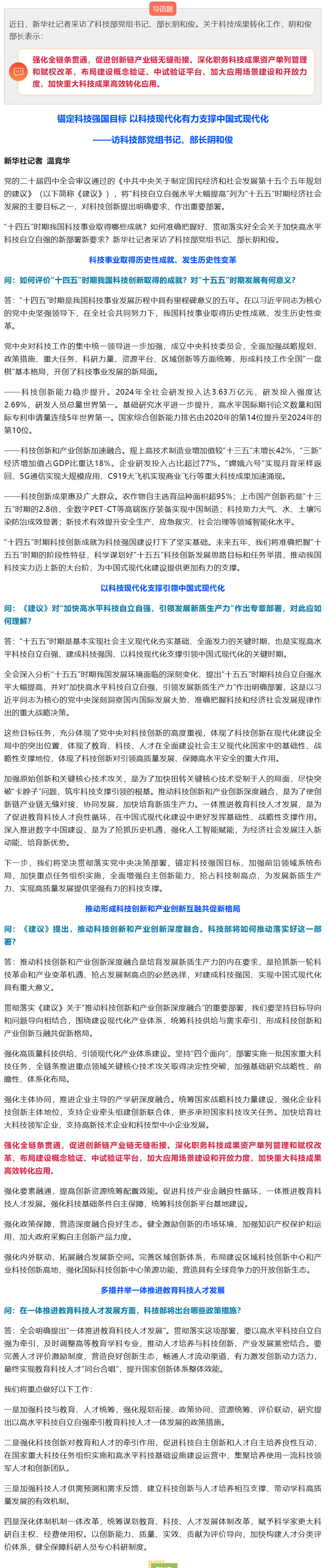 摘 要:事关科技成果转化!科技部部长阴和俊接受新华社专访这样强调