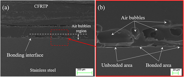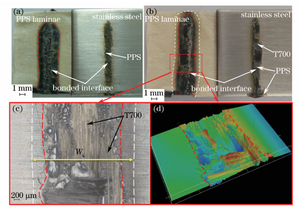 中国科学院宁波材料技术与工程研究所先进制造技术所激光与智能能量场制造团队与北京大学深圳研究院合作,对CFRTP/异质金属结构的激光连接机理和工艺进行了研究。利用激光直接连接技术实现了CFRTP与不锈钢的连接,研究了界面状态对CFRTP/不锈钢激光连接质量的影响规律,对接头的连接机理和失效机制进行了分析,同时对缺陷控制工艺进行了探索性研究,相关成果发表在Journal of Materials Processing Technology上(http://dx.doi.org/10.1016/j.jmatprotec.2016.10.013);在考虑CFRTP/不锈钢界面接触热导率的基础上建立了激光连接热热效应数学模型,利用有限元方法对连接热效应进行了仿真计算,分析发现该模型可准确表征夹具压力对激光连接质量的影响,较传统数学模型可有效提高热效应仿真的准确性,相关研究发表在《中国激光》 (2017,44(4):0402002.)上;通过对金属界面进行微织构处理可显著提高连接强度,申请发明专利2项,授权1项(热塑性复合材料焊接方法CN201510014414.4)。