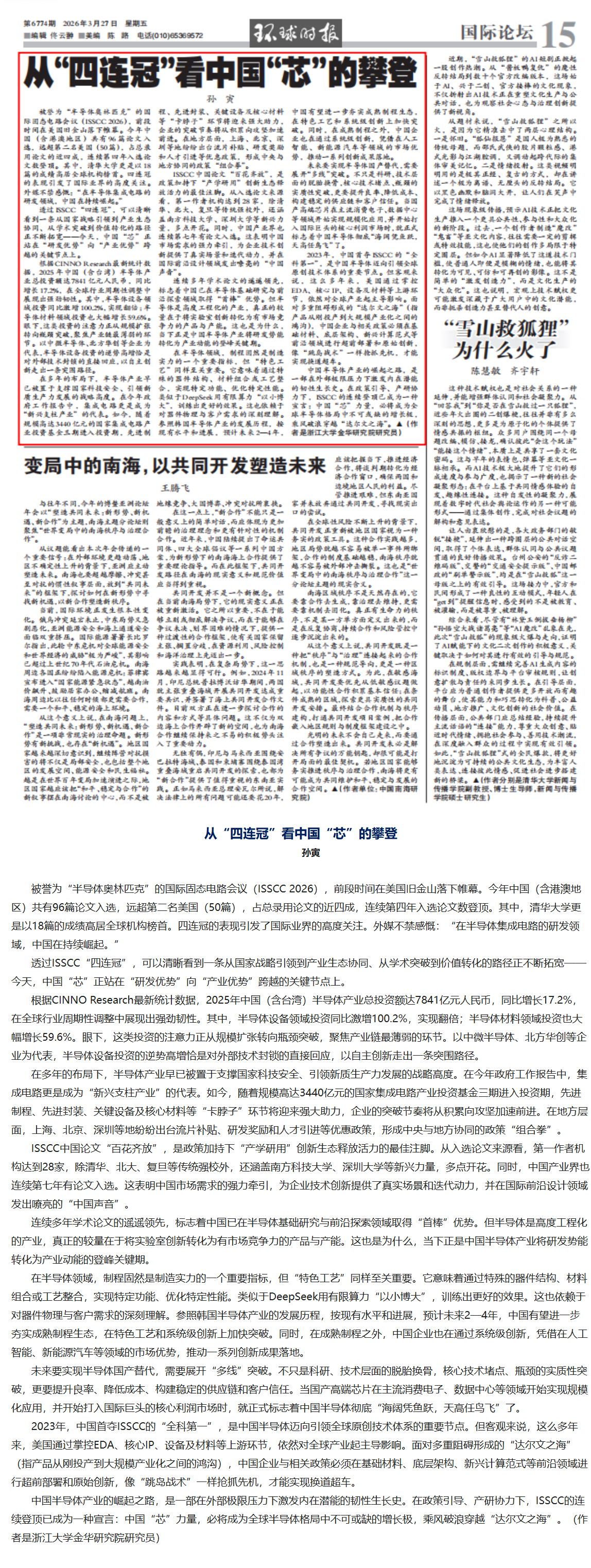 3月27日,《环球时报》刊发浙江大学金华研究院智库中心研究员孙寅署名文章——《从“四连冠”看中国“芯”的攀登》。文章指出,中国半导体产业在ISSCC国际会议上实现论文数量“四连冠”的历史性突破,标志着研发优势已初步确立,但真正的较量在于将实验室创新转化为有市场竞争力的产品。唯有跨越从“研发势能”到“产业动能”的关键鸿沟,才能从“学术领先”真正迈向定义全球格局的“产业强国”。