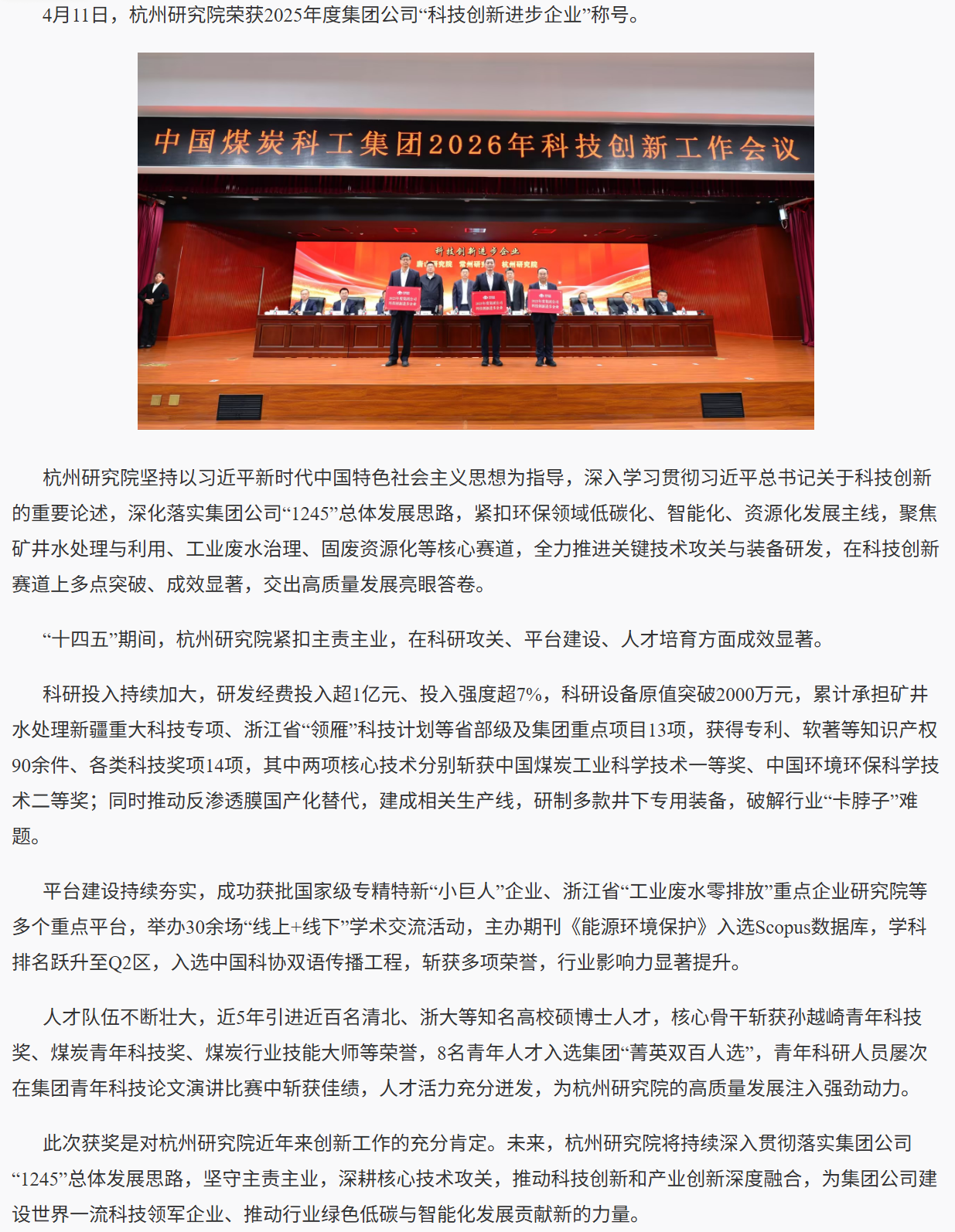 摘 要:杭州研究院荣获2025年度集团公司科技创新进步企业