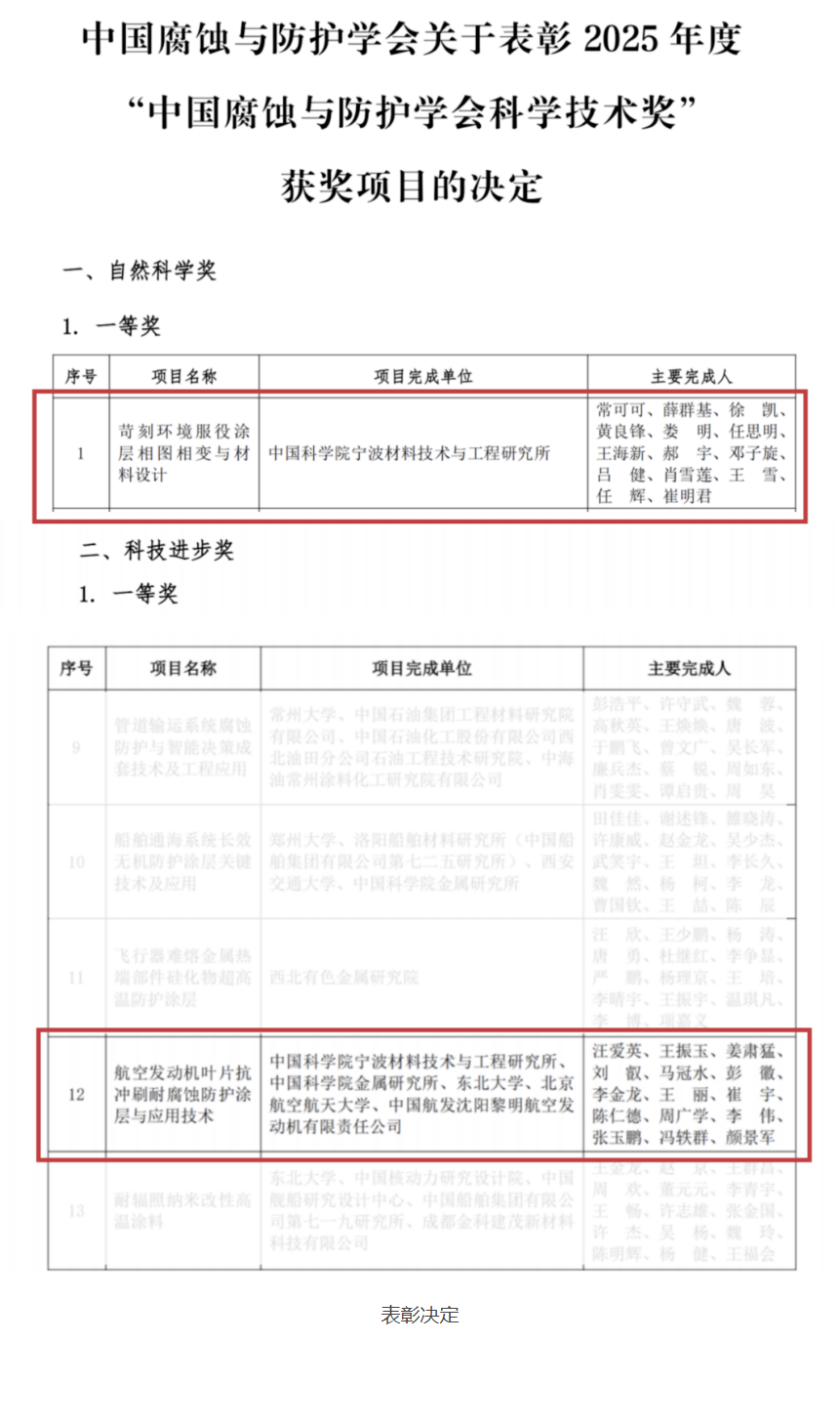 近日,中国腐蚀与防护学会正式公布2025年度“中国腐蚀与防护学会科学技术奖”获奖项目。海洋关键材料全国重点实验室在本次评选中表现突出,一举摘得两项一等奖,展现了实验室在腐蚀科学与防护技术领域深厚的研发实力与持续的创新活力。两项一等奖均由中国科学院宁波材料技术与工程研究所作为第一完成单位。