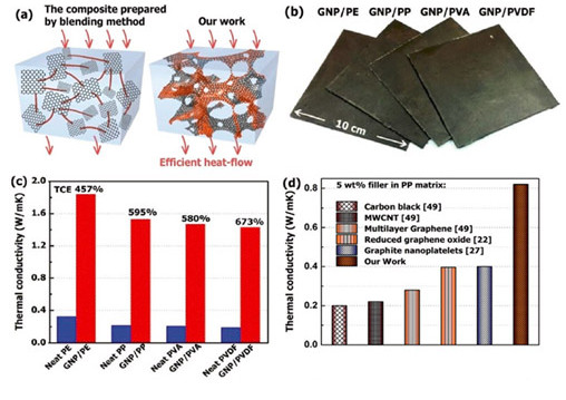 中国科学院宁波材料技术与工程研究所表面事业部功能碳素材料团队开发了一种低成本、工艺简单、且能大规模应用的石墨烯/高分子高导热复合材料的制备方法,将高分子粉体表面均匀包裹上石墨烯纳米片,再通过热压制备成复合材料。通过此工艺,石墨烯能在高分子基底中形成了胞室状的三维结构,其复合材料热导率能达到一般熔融混合法产品的两倍。这种方法适用于各类热塑性聚合物,包含对聚乙烯、聚乙烯醇、聚偏氟乙烯等,在重量百分率10 %的石墨烯添加量下,能将高分子聚合物的本征热导率提高5 – 6倍。这一工作有助于推动石墨烯相关高分子导热复合材料的制备及应用的发展。