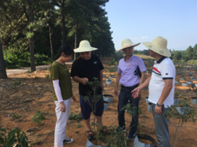 杨华与项目组主要成员查看了苗木的生长情况,并咨询了高温环境下基地对苗木的管理情况,对基地的建设总体表示满意,但对存在的问题也提出了意见和建议。连续高温,苗木生长受到了一定程度的影响,必需加大人工浇水的力度,积极降低灾害损失。同时对培育的小苗,加强管理,破损的遮阳网应重新加盖,生长过高的小苗可打顶以促进萌发枝条。及早对基地的白蚁危害进行治理,减少苗木的损失。