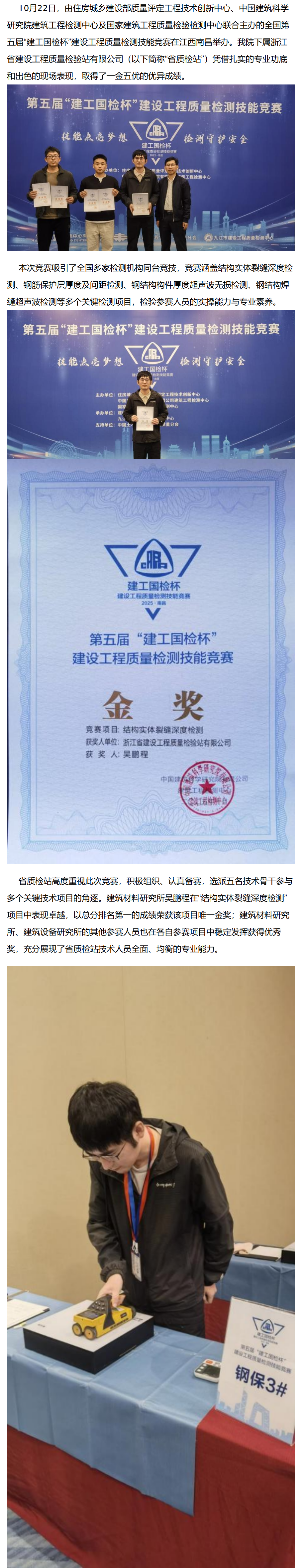 浙科·匠心 | 喜获金奖!浙江省建筑科学设计研究院有限公司质检站在全国第五届“建工国检杯”建设工程质量检测技能竞赛中荣获佳绩