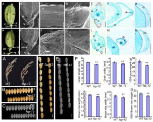 水稻产量构成主要包括有效穗数、每穗实粒数和千粒重三要素。粒形是决定千粒重的重要农艺性状。该团队鉴定了一个FZP的弱等位突变体fzp-12,与前人报道的fzp突变体不同,该突变体呈现籽粒变小和护颖退化的形态。研究人员深入研究发现,籽粒变小主要是颖壳细胞变小和数目减小所致。同时,该突变体护颖退化成副护颖状器官,其超表达护颖伸长转变成外稃状器官,首次揭示了小穗外稃、护颖及副护颖是同源器官的假说。研究结果揭示了FZP基因在调控籽粒大小和护颖发育中的关键作用,证实了外稃、护颖及副护颖在进化过程中的器官同源性。