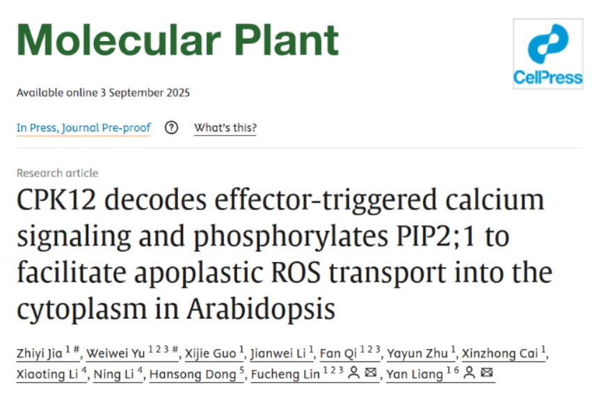 近日,浙江省农业科学院植物保护与微生物研究所真菌与植物免疫研究团队与浙江大学联合在国际权威期刊《Molecular Plant》(IF=24.1)发表题为“CPK12 decodes effector-triggered calcium signaling and phosphorylates PIP2;1 to facilitate apoplastic ROS transport into the cytoplasm in Arabidopsis”的研究成果。该研究首次发现钙依赖性蛋白激酶CPK12能够破译效应器触发的Ca2+信号,以调节植物免疫过程中ROS的区室化。CPK12在无毒细菌感染时以Ca2+依赖的方式被激活,并在S280/S283位点磷酸化质膜水通道蛋白PIP2;1。这种磷酸化使质外体ROS能够导入细胞质,从而将效应器触发的Ca2+信号传导与ROS反应的空间调节结合起来。