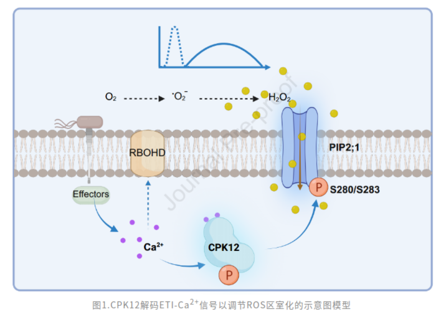 该研究结果表明,CPK12破译了效应器触发的Ca2+信号,以调节ROS的区室化,在NLR介导的Ca2+信号和植物免疫中ROS反应的空间控制之间建立了关键联系。