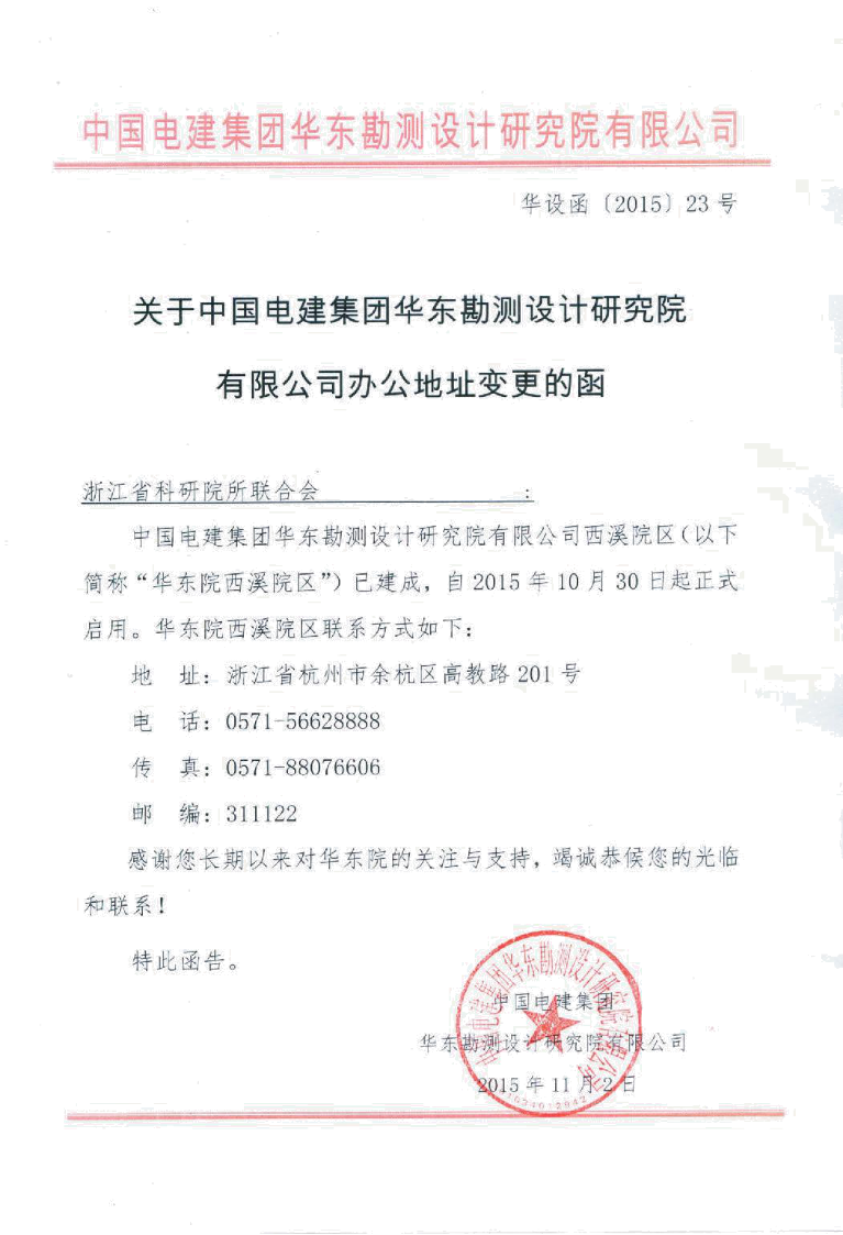 关于中国电建集团华东勘测设计研究院有限公司办公地址变更的函