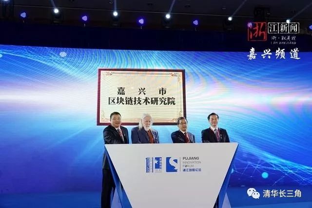 图灵奖获得者Diffie教授,嘉兴市政府副市长盛全生,南湖区委书记朱苗,研究院副院长张海戈先生为嘉兴市区块链技术研究院揭牌。