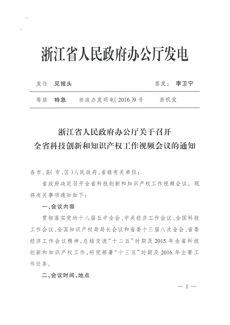 附件:浙江省人民政府办公厅关于召开全省科技创新和知识产权工作会议的通知
